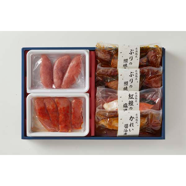 内容:辛子明太子150g、あごだしうまみたらこ150g、かれい醤油煮100g×1、紅鮭塩焼き60g×1、ぶりの照焼き90g×2