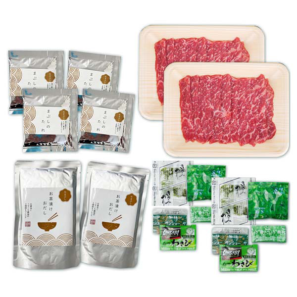 内容:飛騨牛まぶしセット(もも焼肉140g×2、まぶしキット(出汁150g×2・タレ20g×2、のり0.8g×2、わさび1.3g×2、柚子胡椒1g×2、山椒0.2g×2))