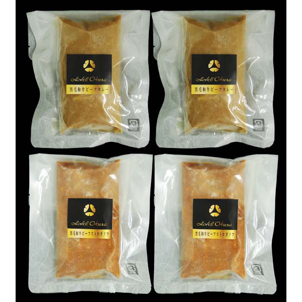 内容:黒毛和牛ビーフストロガノフ180g×2、黒毛和牛ビーフカレー230g×2