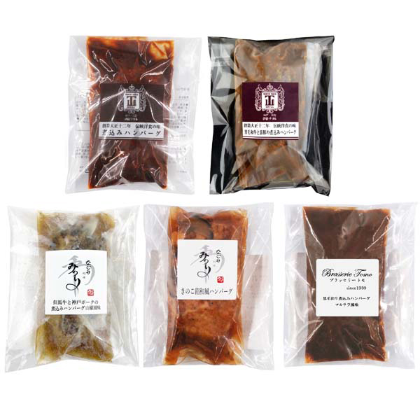 内容:ブラッセリートモ黒毛和牛煮込みハンバーグマルサラ風味190g(固形量110g)、みのり和風きのこ餡煮込みハンバーグ180g(固形量110g)、みのり但馬牛と神戸ポーク煮込みハンバーグ山椒風味180g(固形量110g)、伊藤グリル煮込みハンバーグ180g(固形量110g)、伊藤グリル黒毛和牛と黒豚の煮込みハンバーグ190g(固形量110g)