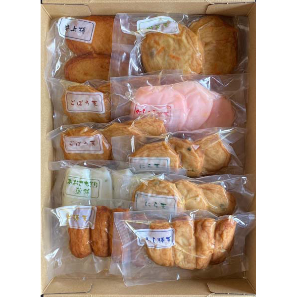 内容:にら天(3個)×2、紅しょうが天×3、ごぼう天(3個)×2、特上揚×2、あおさちぎり蒲鉾×4、上棒天×4、野菜天×2、いわし棒天×4