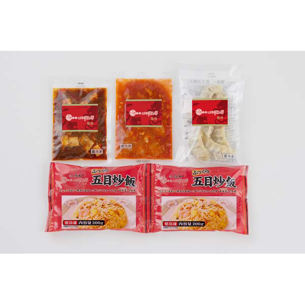 内容:乾焼蝦仁(エビチリソース)150g、四川麻婆豆腐150g、餃子120g(6個入)、ふっくら五目炒飯(200g×2)×各1