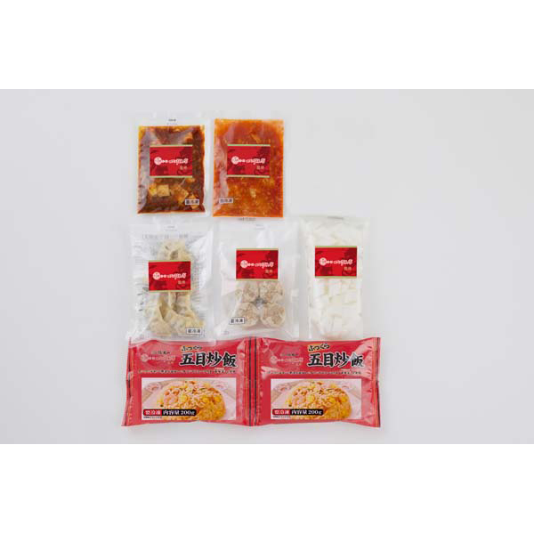 内容:乾焼蝦仁(エビチリソース)150g、四川麻婆豆腐150g、餃子120g(6個入)、ふっくら五目炒飯(200g×2)、貝柱入焼売150g(5個入)、杏仁豆腐500g×各1