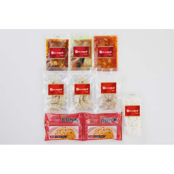 内容:餃子120g(6個入)×2、乾焼蝦仁(エビチリソース)150g、四川麻婆豆腐150g、ふっくら五目炒飯(200g×2)、貝柱入焼売150g(5個入)、杏仁豆腐500g、本格八宝菜150g×各1