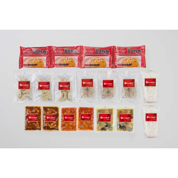 内容:乾焼蝦仁(エビチリソース)150g、四川麻婆豆腐150g、ふっくら五目炒飯(200g×2)、杏仁豆腐500g、本格八宝菜150g×各2、貝柱入焼売120g(4個入)、餃子120g(6個入)×各3