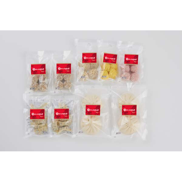 内容:餃子120g(6個入)、手包み肉まん240g(2個入)、貝柱入焼売150g(5個入)×各2、小籠包140g(4個入)、錦糸焼売125g(5個入)、珍珠丸子175g(チンツーワンズ、5個入)×各1