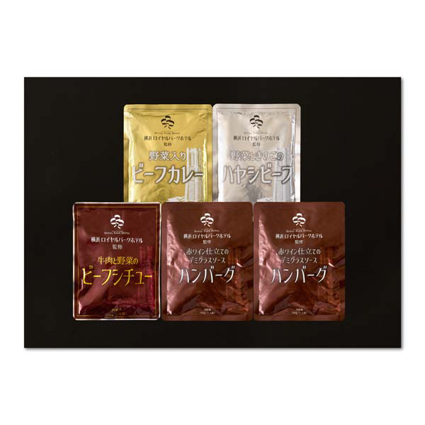 横浜ロイヤルパークホテル監修のカレー、ハヤシビーフ、ビーフシチュー、デミグラスソースハンバーグの4種類を味わえるセットです。湯せんするだけですぐにお召し上がりいただけます。