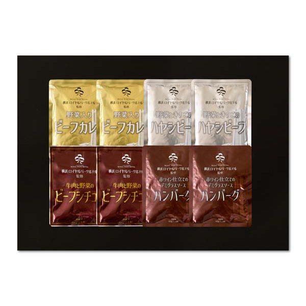 横浜ロイヤルパークホテル監修のカレー、ハヤシビーフ、ビーフシチュー、デミグラスソースハンバーグの4種類を味わえるセットです。湯せんするだけですぐにお召し上がりいただけます。