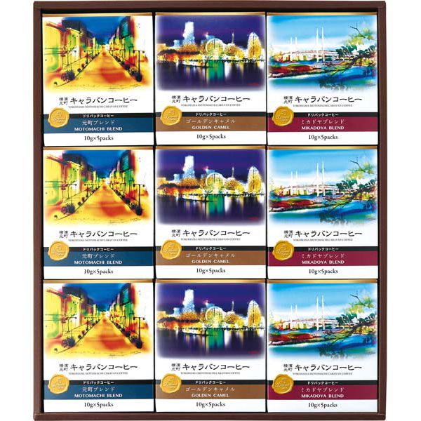 1928年に横濱馬車道で生まれた老舗「キャラバンコーヒー」をいつでもどこでも楽しめるドリパックコーヒーギフトセットです。看板商品ゴールデンキャメル、酸味とコクが一体となった元町ブレンド、爽やかな酸味と甘みのミカドヤブレンドの3種類のお味が楽しめます。 ※横濱001認定商品です。