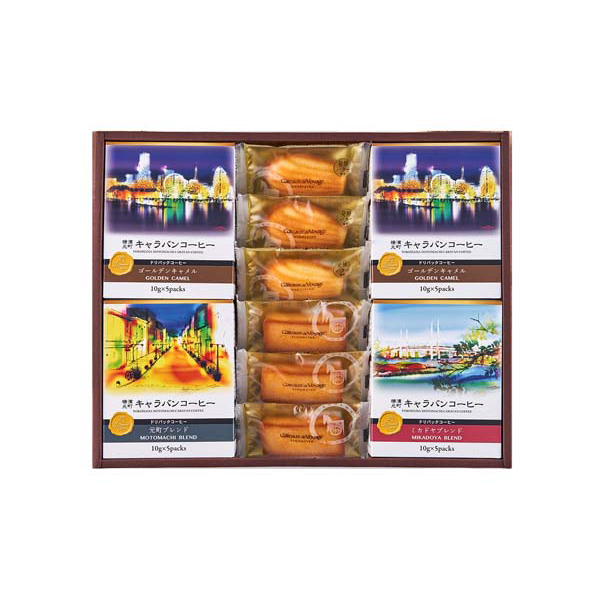 内容:キャラバンコーヒー(ゴールデンキャメル(10g×5)×2、元町ブレンド(10g×5)×1、ミカドヤブレンド(10g×5)×1)・ガトー・ド・ボワイヤージュ(発酵バターマドレーヌ、焦がしバターフィナンシェ×各3)