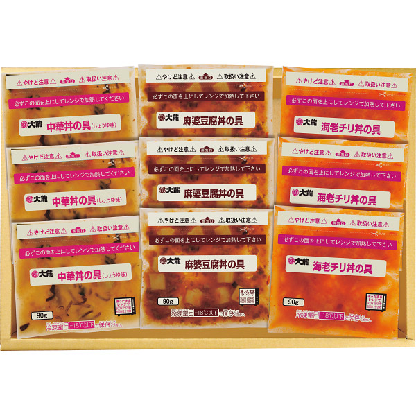 内容:海老チリ丼の具90g×3、中華丼の具(醤油味)90g×3、麻婆豆腐丼の具90g×3