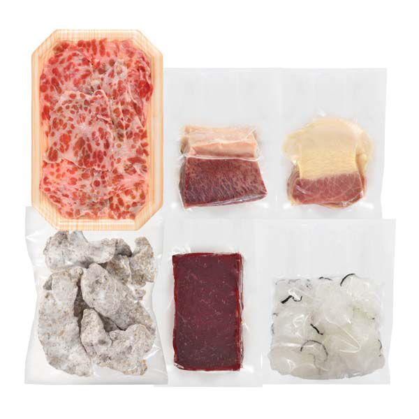 内容:鯨竜田揚げ150g、鯨赤身肉(刺身用)100g、鯨おばいけ100g、鯨舌ボイル90g、鹿の子スライス50g、鯨ベーコンスライス50g
