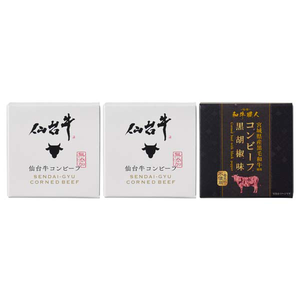 内容:仙台牛コンビーフ95g缶×2個、宮城県産黒毛和牛コンビーフ黒胡椒味95g缶×1個