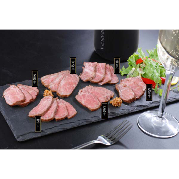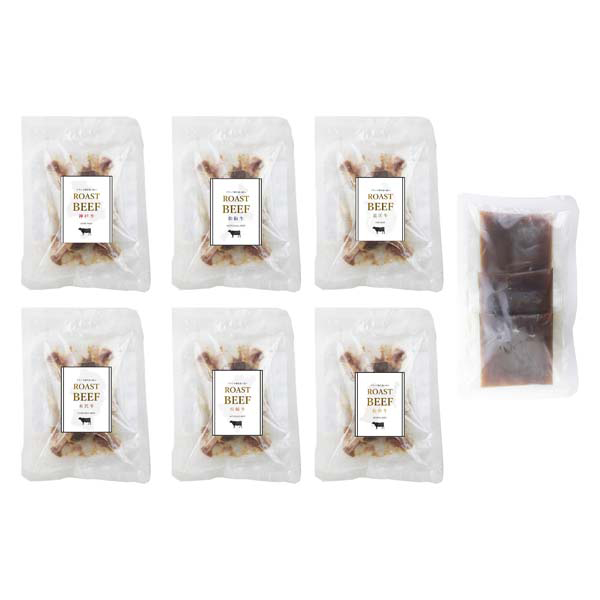 内容:神戸牛ローストビーフ・松阪牛ローストビーフ・近江牛ローストビーフ・米沢牛ローストビーフ・仙台牛ローストビーフ・宮崎牛ローストビーフ 各50g×1個、オニオンソース40g×3