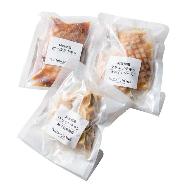 内容:阿波尾鶏グリルドチキン160g、オニオンソース40g、阿波尾鶏照り焼きチキン210g(2枚入)、阿波尾鶏ひとくちチキン柚子胡椒風味120g