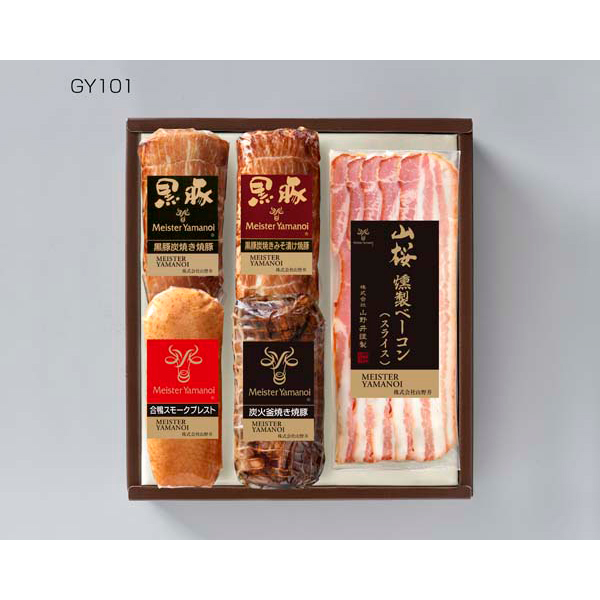 内容:黒豚炭焼き焼豚190g、黒豚炭焼きみそ漬け焼豚190g、炭火釜焼き焼豚190g、合鴨スモークブレスト130g、山桜燻製ベーコン(スライス)50g