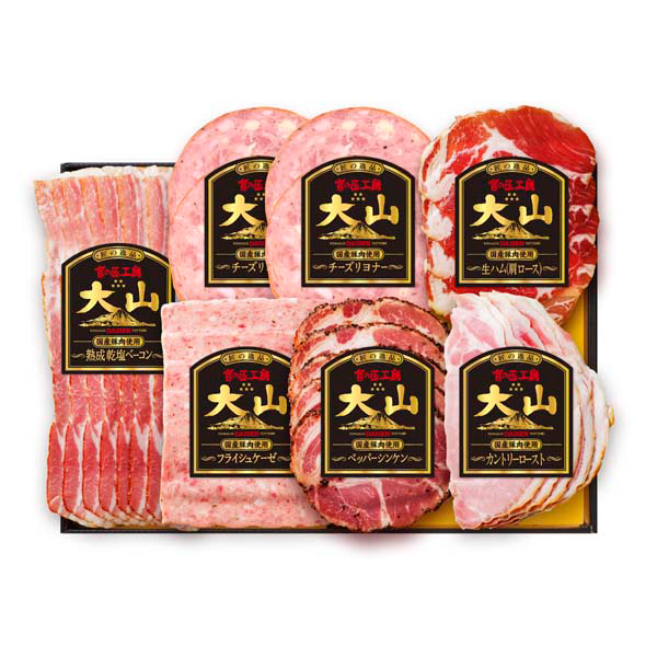 内容:ペッパーシンケン72g、カントリーロースト72g、生ハム(肩ロース)40g、熟成乾塩ベーコン80g、フライシュケーゼ80g、チーズリヨナー36g×2