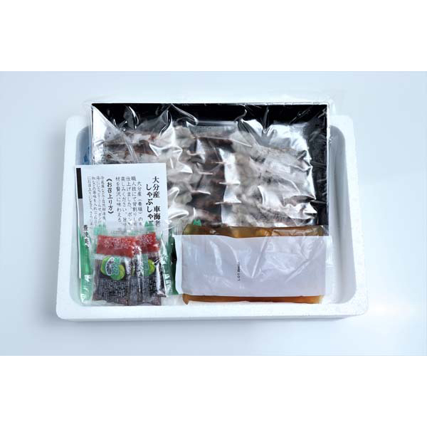 大分県産の新鮮な車海老を、丁寧に殻をむき、背わたを取ってしゃぶしゃぶ用に仕立てました。魚介だしの和風スープにくぐらせ、ポン酢などを付けてお召し上がりください。