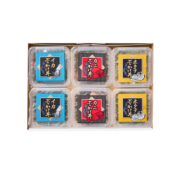 内容:イカぶっかけ丼・カニぶっかけ丼・ホタテぶっかけ丼 各70g×2個