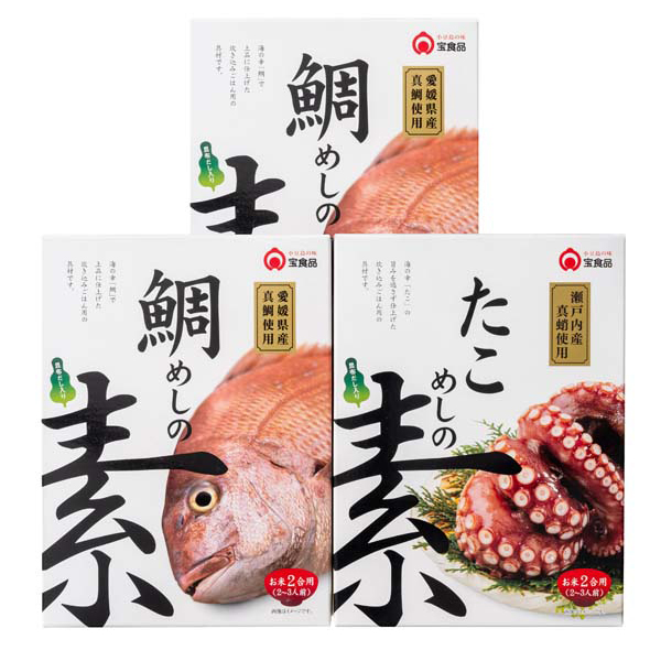 内容:鯛めしの素(鯛カマ1切、調味液150g)×2・たこめしの素230g×1 各2合用