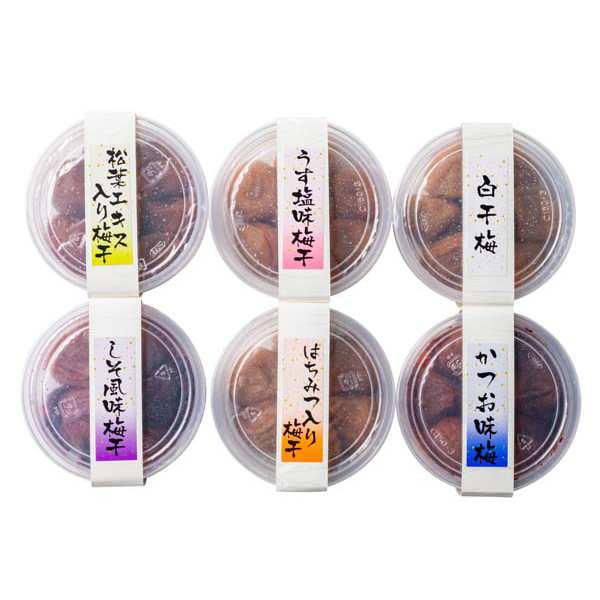 内容:松葉エキス入り梅干(塩分約14%)・うす塩味梅干(塩分約6%)・白干梅(塩分約20%)・しそ風味梅干(塩分約8%)・はちみつ入り梅干(塩分約8%)・かつお味梅(塩分約14%) 各80g