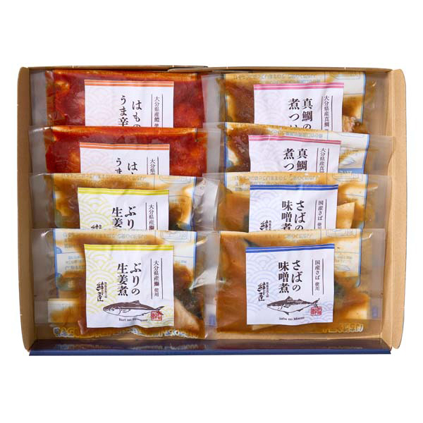 内容:ぶり生姜煮・真鯛煮つけ・さば味噌煮・はも旨辛煮 各70g×2切(計8切)