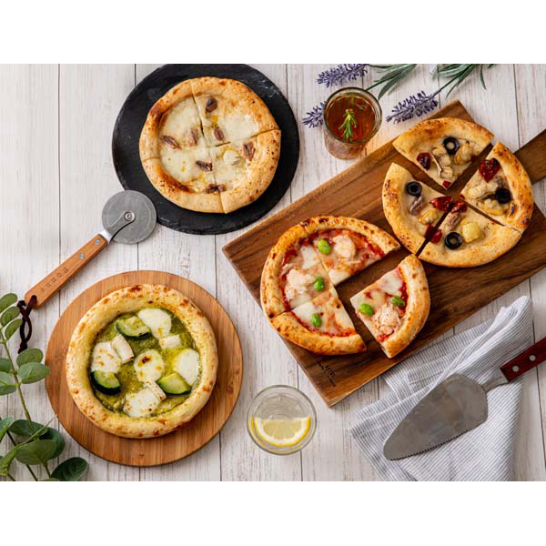 内容:まるずわいがにとだだ茶豆のトマトピザ・アンチョビとローストガーリックのピザ・魚介たっぷりのマリナーラピザ・ローストいかのジェノベーゼピザ×各1枚(直径約15cm)