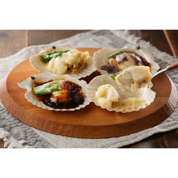貝の直径10cm前後の北海道産片貝帆立を使用し、ホワイトソースのグラタン仕立てと、デミグラスソースとチーズを乗せて焼いたデミグラスチーズ焼きにしました。どちらも電子レンジで温めるだけの簡単調理でいただけます。