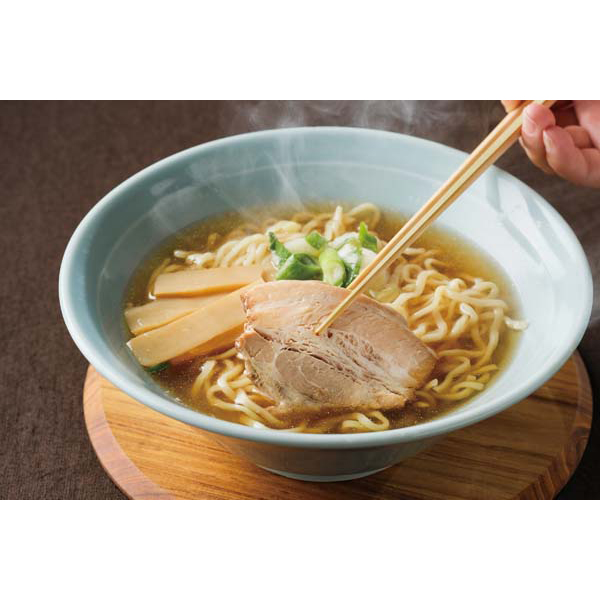 2種類の小麦粉を練り込んで熟成させた麺は、モチモチした食感とツルッとした喉ごしが魅力。コクがありながらもあと口があっさりしている醤油スープとの相性は抜群です。トロッとやわらかい自家製チャーシューやメンマなどの具材も添えてお届けします。