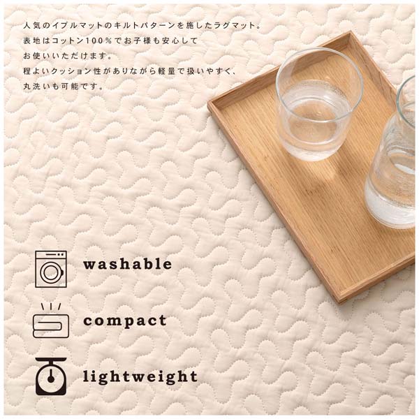 ●人気のイブルマットのキルトパターンを施したラグマット。●表地はコットン100%なのでお子様にも安心。●程よいクッション性がありながら軽量で扱いやすく丸洗いも可能。●イブルマットで人気のキルトパターンを採用した、トレンド感のあるデザイン。●非常に軽量な設計なので、持ち運びも簡単で扱いやすいのがポイント。●コンパクトに小さく畳む事が出来るので収納にも困りません。●程よいクッション性で床付き感が少なく快適。●洗濯機で丸洗いする事が出来るので衛生的。●裏面は滑り止めが付いているので安心。