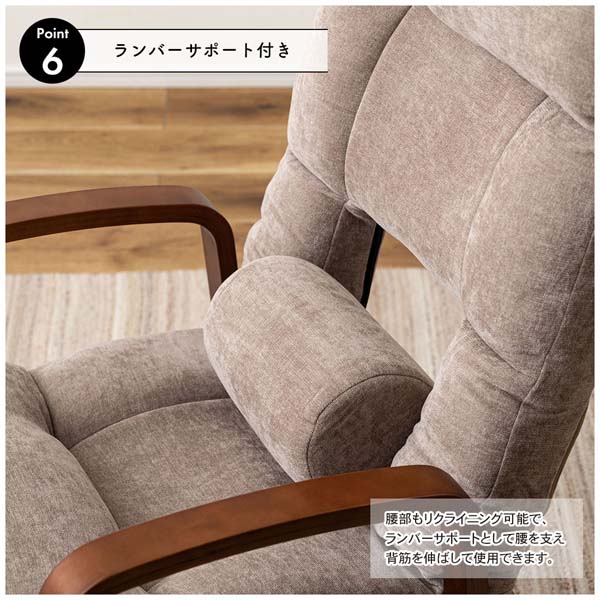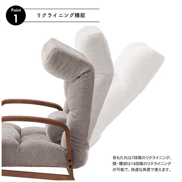 ●リクライニング機能で、自分にぴったりのチェアに調整が可能な高座椅子。●立ち上がりやすい肘掛の形状や持ち運びやすさなど、使う人に寄り添った設計の高座椅子。●腰を支えるランバーサポートと、首を支えるヘッドレスト付き。●背もたれは7段階リクライニング。●頭・腰部は14段階リクライニング。●自分の好みに合わせて快適な姿勢に調整。●背もたれは折りたたみが可能で、使わない時は最小限のスペースで保管。●掴みやすい形状の肘掛で、立ったり座ったりの動作をサポート。●しっかりと硬めのクッションで、長時間座っても疲れにくい設計。●ヘッド部分が独立してリクライニングするので、ヘッドレストとして頭を預けてリラックス。●腰部もリクライニング可能で、ランバーサポートとして腰を支え背筋を伸ばして使用可能。●脚裏にはフェルトが付いているので、床への傷防止にもなり安心。