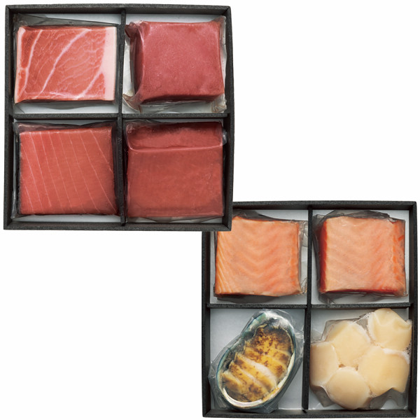 内容:一の重:本マグロ大トロ柵・本マグロ赤身柵(本まぐろ:地中海産)・メバチマグロ中トロ柵・メバチマグロ赤身柵(メバチマグロ:韓国産)100g×各1、二の重:アトランティックサーモン柵・サーモントラウト柵(サーモン:ノルウェー産又はアイスランド産)90g×各1、ホタテ貝柱(ホタテ:北海道産)100g×1、エゾアワビ刺身カット(エゾアワビ:韓国産)90g×1※(約3~4人前)解凍した商品は、お早めにお召し上がりください。
