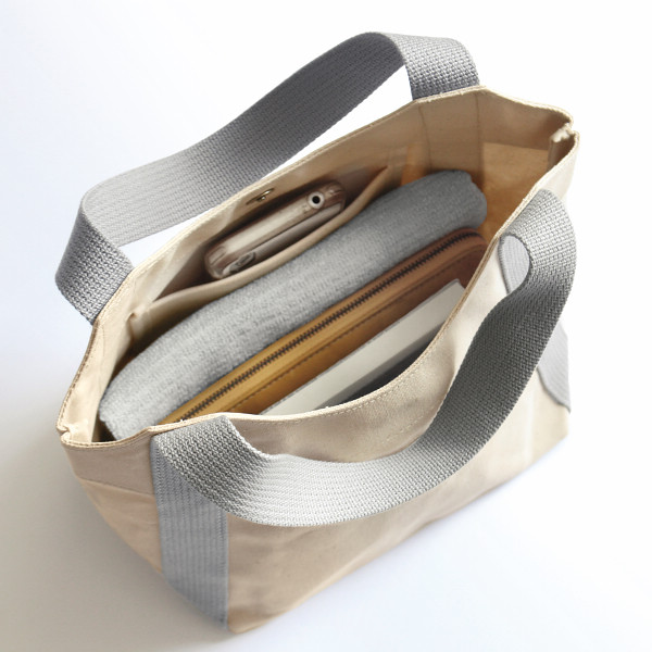 ラウンドカットの開口部が女性らしい、きれいめカジュアルなトートバッグ。500mlペットボトルや長財布が入る、ちょっとした外出にちょうどいいサイズです。中と外それぞれにポケット付きで便利。軽くてやわらかい、10号帆布を使用。国産帆布の約7割を生産する岡山県倉敷産の帆布を使った、使うほどに風合いと味がでるバッグです。