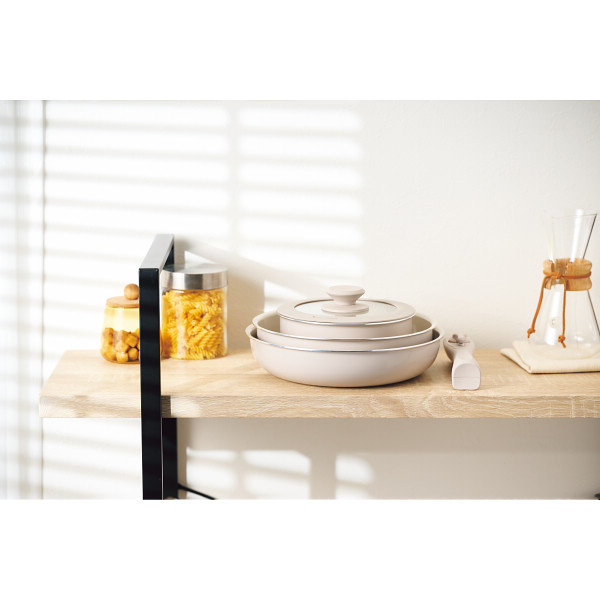 内容:蓋付片手鍋18cm=容量約2l(深さ約7.8cm)、深型フライパン24cm=深さ約7cm、フライパン26cm=深さ約5.6cm、ハンドル、蓋ガスコンロ可、100・200V電磁調理器対応