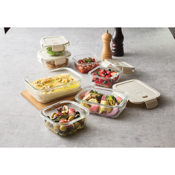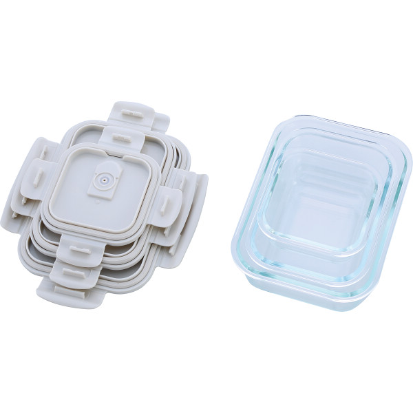 内容:角型320ml(約12.1×12.1×5.8cm・320ml)×3、角型520ml(約14×14×6.4cm・520ml)×2、角型640ml(約17.7×13.5×6.2cm・640ml)×1、角型1.05l(約20.9×16×6.8・1.05l)×1オーブンレンジ可(本体のみ)・電子レンジ可(本体、蓋)
