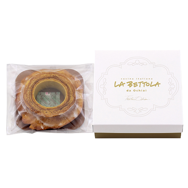 「ラ・ベットラ・ダ・オチアイ」落合シェフ監修の、オレンジピールを細かく刻んで生地に練り込み丁寧に焼き上げたバウムクーヘンです。外側に薄くシュガーコーティングをしてサクッと香ばしい食感に仕上げました。