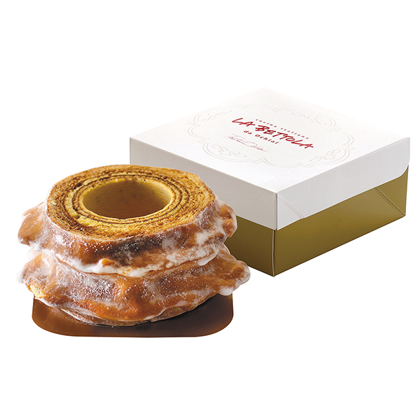 「ラ・ベットラ・ダ・オチアイ」落合シェフ監修の、オレンジピールを細かく刻んで生地に練り込み焼き上げたバウムクーヘンです。内側はしっとり、シュガーコーティングした外側はサクッとした食感です。