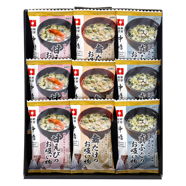 お湯を注ぐだけの手軽さで、長期保存も可能なフリーズドライ製法のお吸い物3種セットです。真ふぐ、甘えび、舞茸のそれぞれの味わいをいかすように昆布やかつおだしなどで味を整えました。