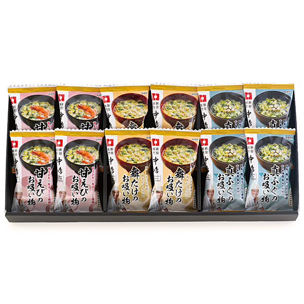 お湯を注ぐだけの手軽さで、長期保存も可能なフリーズドライ製法のお吸い物3種セットです。真ふぐ、甘えび、舞茸のそれぞれの味わいをいかすように昆布やかつおだしなどで味を整えました。