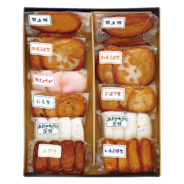 内容:特上揚・れんこん天 各2個入×2、あおさちぎり蒲鉾4個入×2、ごぼう天・にら天・紅しょうが天 各3個入×1、いわし棒天・上棒天 各4個入×1/計33個