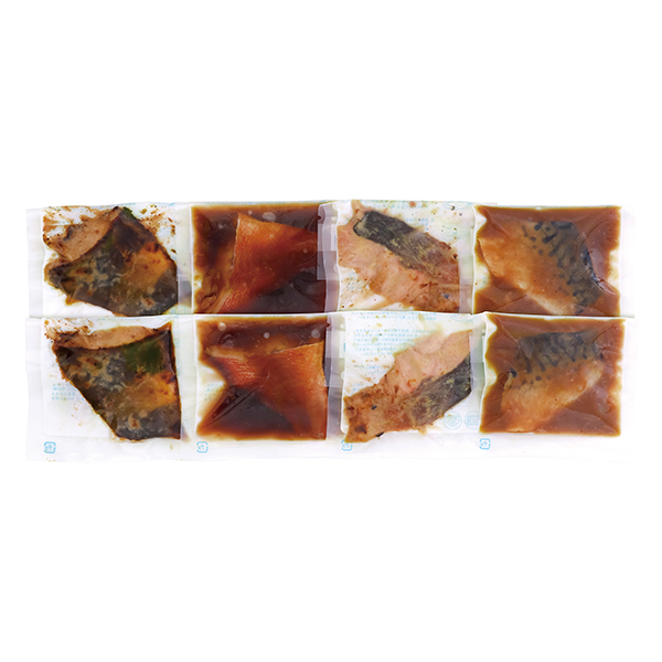 内容:秋鮭西京焼き・縞ほっけ甘味噌焼き・赤魚煮付・さば味噌煮 各50g×2