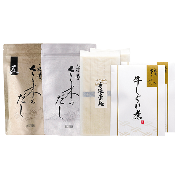 内容:だしパック8g×10入、だしパック匠(食塩不使用)11g×10入、牛しぐれ煮50g×2、手延べ素麺(50g×5束)×2