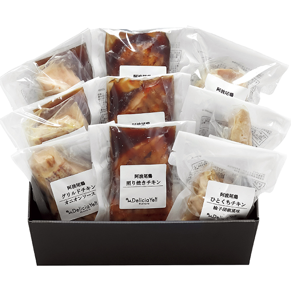 内容:グリルドチキン160g(オニオンソース40g付)×3袋、照り焼きチキン210g(2枚入)×3袋、ひとくちチキン120g(むね肉/柚子胡椒風味)×3袋