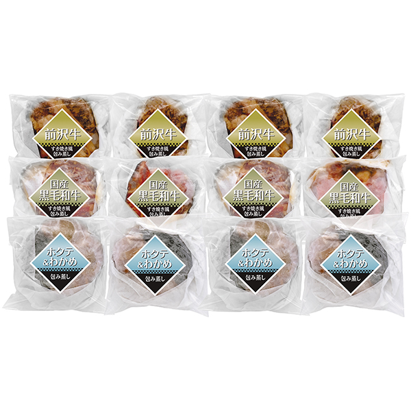 内容:黒毛和牛すき焼き風 包み蒸し135g×4個、ホタテ&わかめ 包み蒸し155g×4個、前沢牛すき焼き風 包み蒸し135g×4個/計12個