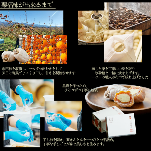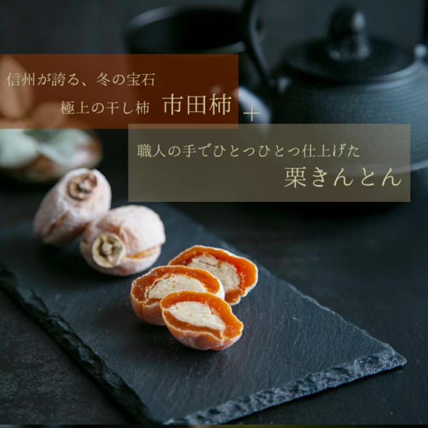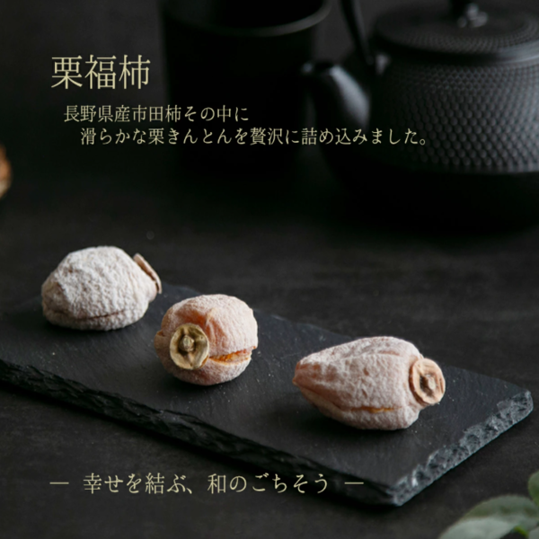 長野県産市田柿その中に滑らかな栗きんとんを贅沢に詰め込みました。