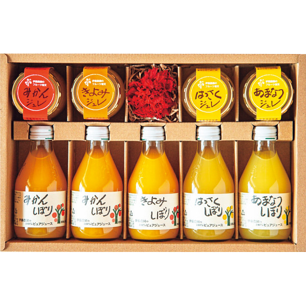 内容:100%ピュアジュース180ml(みかん×2、きよみ・はっさく・あまなつ×各1)、ピュアフルーツ寒天ジュレ90g(みかん、きよみ、はっさく、あまなつ)×各1