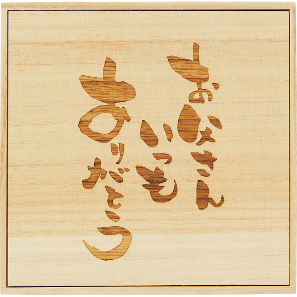キューブタイプのカステラ4種(プレーン・宇治抹茶・ショコラ・いちご)を紙箱に入れ、「お父さんいつもありがとう」のメッセージを桐箱に入れてお届けします。
