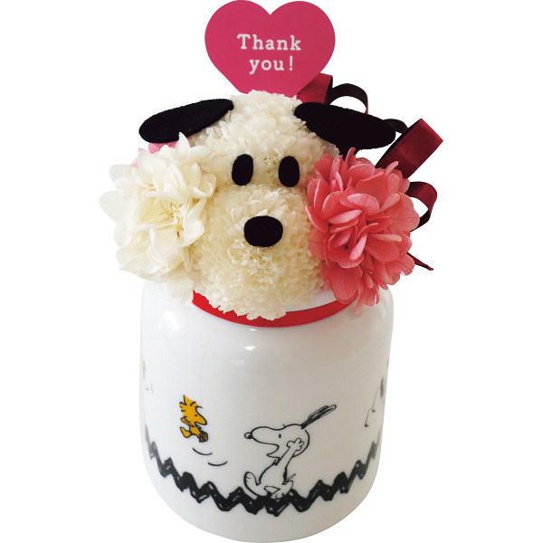 プリザーブドフラワーで作ったスヌーピーが器からちょこんと顔を出しているようなデザインが可愛いアレンジメント。「ありがとう!」の気持ちを伝える「Thank you」ピック付き。感謝の気持ちを伝えるサプライズギフトにぴったりです。