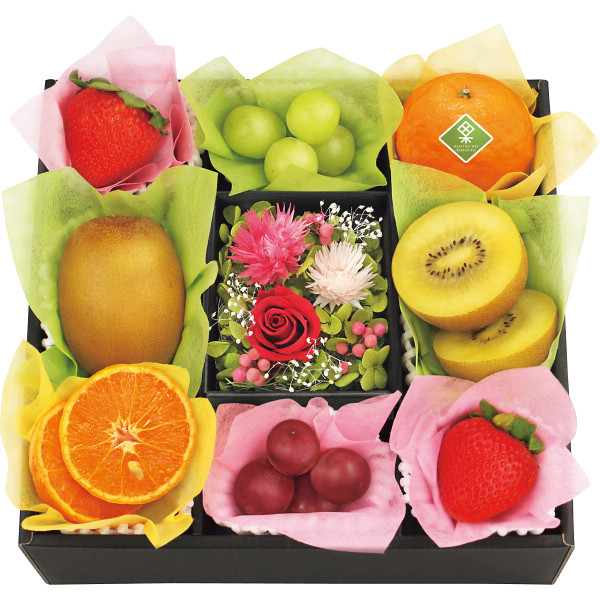内容:ぶどう(赤・青)(チリまたはオーストラリア産)×各3~4、いちご(佐賀県産)・カラマンダリン(和歌山県または愛媛県または三重県産)・ゴールドキウイ(ニュージーランド産)×各2、プリザーブドフラワー×1