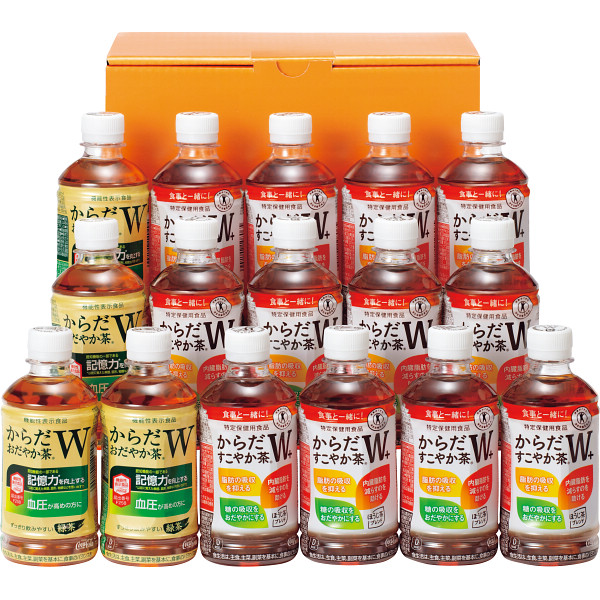 機能性表示食品の「からだおだやか茶W」と特定保健用食品の「からだすこやか茶W+」が入った毎日の健康を意識する方におすすめのギフトです。